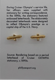 Did you know it was customary, especially during Cruiser Olympia’s time, to provide officers with stationary for correspondence? The logo showcased above was from the 1890s, and would have been embossed on letterhead. Because of the ship’s prestige as a capital ship of the U.S. Navy, the artwork was more elaborately designed than others.
