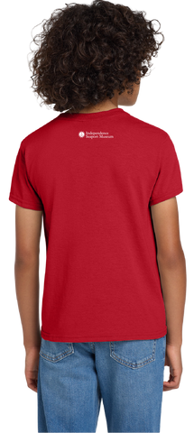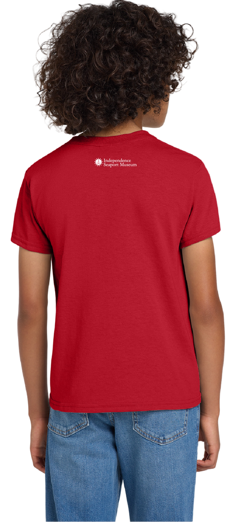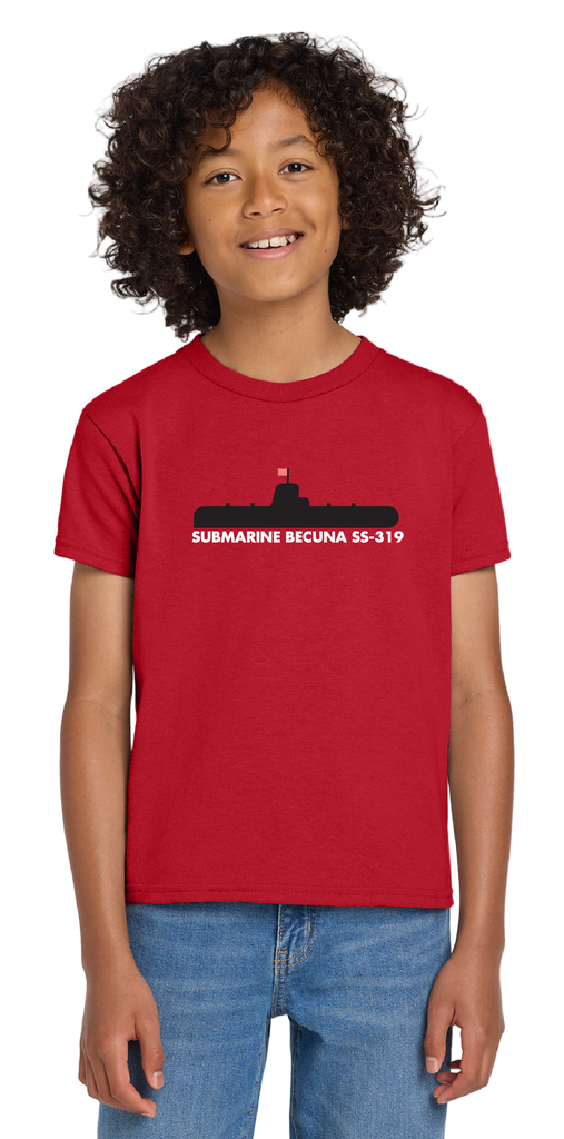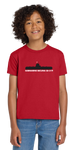 A playful red t-shirt featuring a design of Submarine Becuna. Available in sizes Youth Extra Small - Youth Extra Large. 50/50 Poly/Cotton Blend